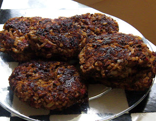 This recipe is a copycat version of Houston’s Restaurant’s Veggie Burger, a favorite of mine. (Pictured here with Burpee’s Early and Often hybrid tomato, Purple Beauty Sweet Pepper, dill pickles from Picklebush cucumbers, and some variety of chicory, I think.) It is a big improvement over the frozen grocery v-burger, and the ingredients are relatively inexpensive and easy to find. My other favorite v-burger, from the famous (among vegetarians and quasi-vegetarians) Laurel’s Kitchen Cookbook is a bit pricey as the main ingredient is walnuts.