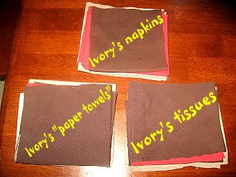 (P.S. 11/22/08) If you want to see a really PRETTY way to make interchangeable cloth tissues, napkins, and “paper” towels, go check out these. Great minds, I tell you.