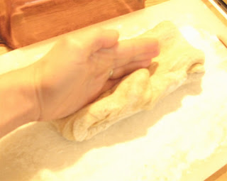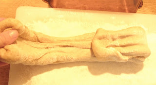 Step 4: Grasp each end of the dough and lift. Stretch the dough out until it is approximately twice the length of the loaf pan you are using, whapping the dough on the board a bit to encourage it to stretch. (This is the best part, the whapping. Whap, whap, whap.) I had to put one side down to snap the picture, but you hold it in both hands to whap.