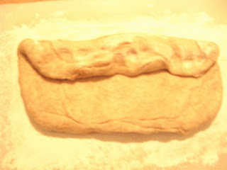 Step 1: Punch down the dough after rising and pat it out on a floured board until it is a rectangular shape, about 6″ x 9″.