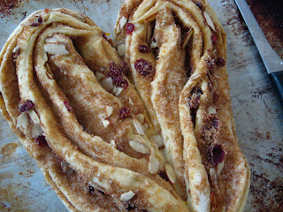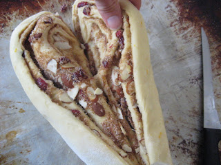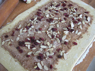 Combine the sugars and cinnamon. Sprinkle over the buttered part of the dough. Top with the cranberries and almonds.