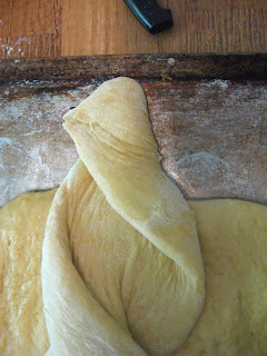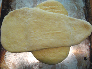 Punch dough down and divide in half. Make two smooth balls of dough. Grease a large baking sheet and flatten one of the balls of dough into an oval about 11 x 6 inches in size (wings) onto the baking sheet.