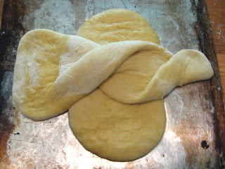 Bake at 350 degrees F. for about 40. minutes. This bread wants to burn, especially the “extremities” and the sugared parts. Cover it with foil after it has been in the oven a few minutes, paying particular attention to the aforementioned places. Brush body of dove (unsugared part) with butter when you take it out of the oven.