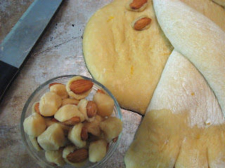 Dissolve yeast in water in a small bowl. Beat together butter, sugar, lemon peel, vanilla and almond extracts, and salt in a large bowl. Beat in the eggs. Add yeast mixture and warm milk. Beat in about 5 cups of the flour. The dough will be soft.